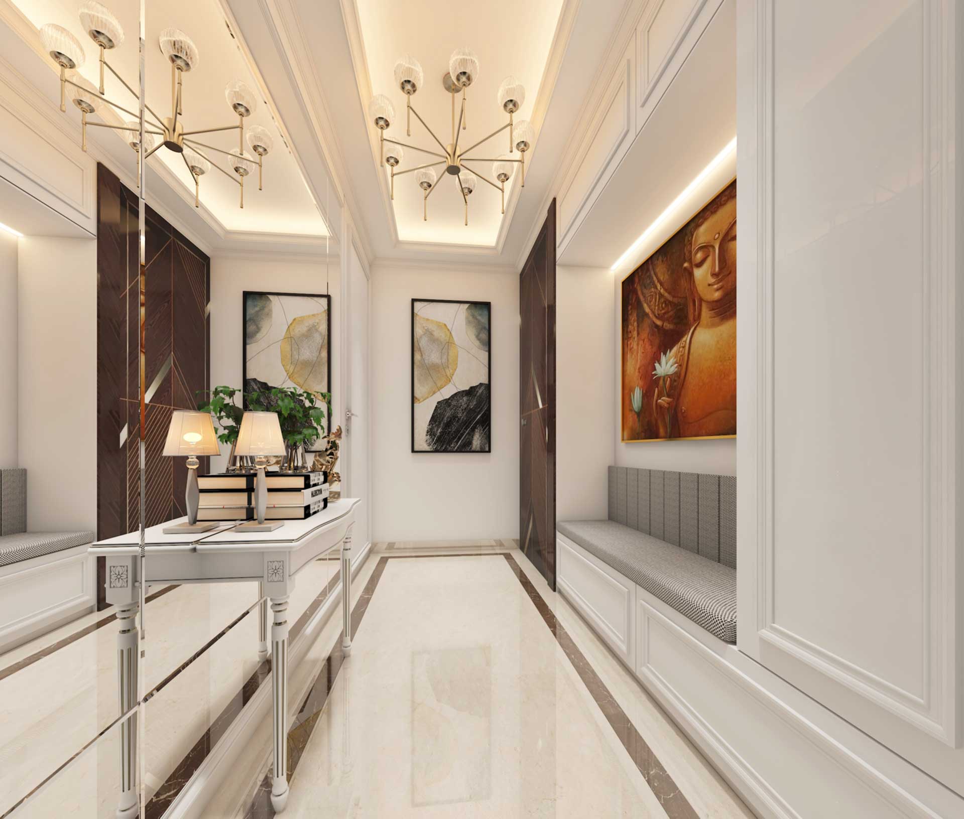 This space has intricately designed ceiling, console table, sophisticated shutters and mirror that give the illusion of a bigger foyer.
