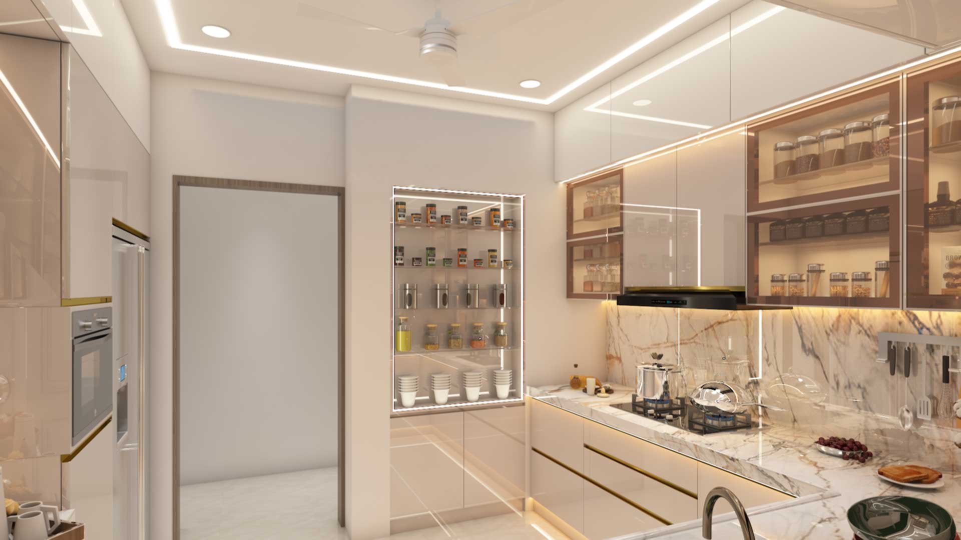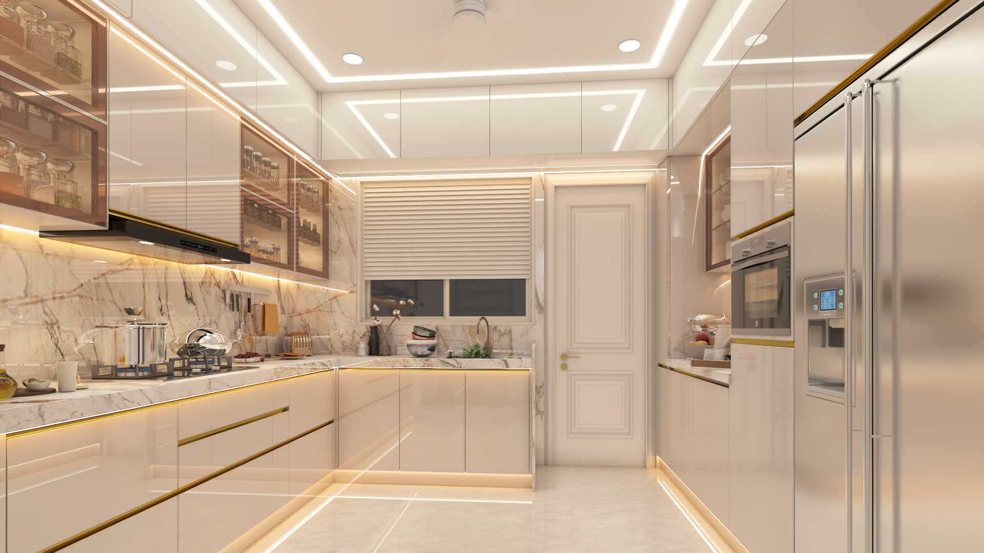 The glossy finishes, rose gold profile shutters and ample ambient lighting give this kitchen a luxurious look.