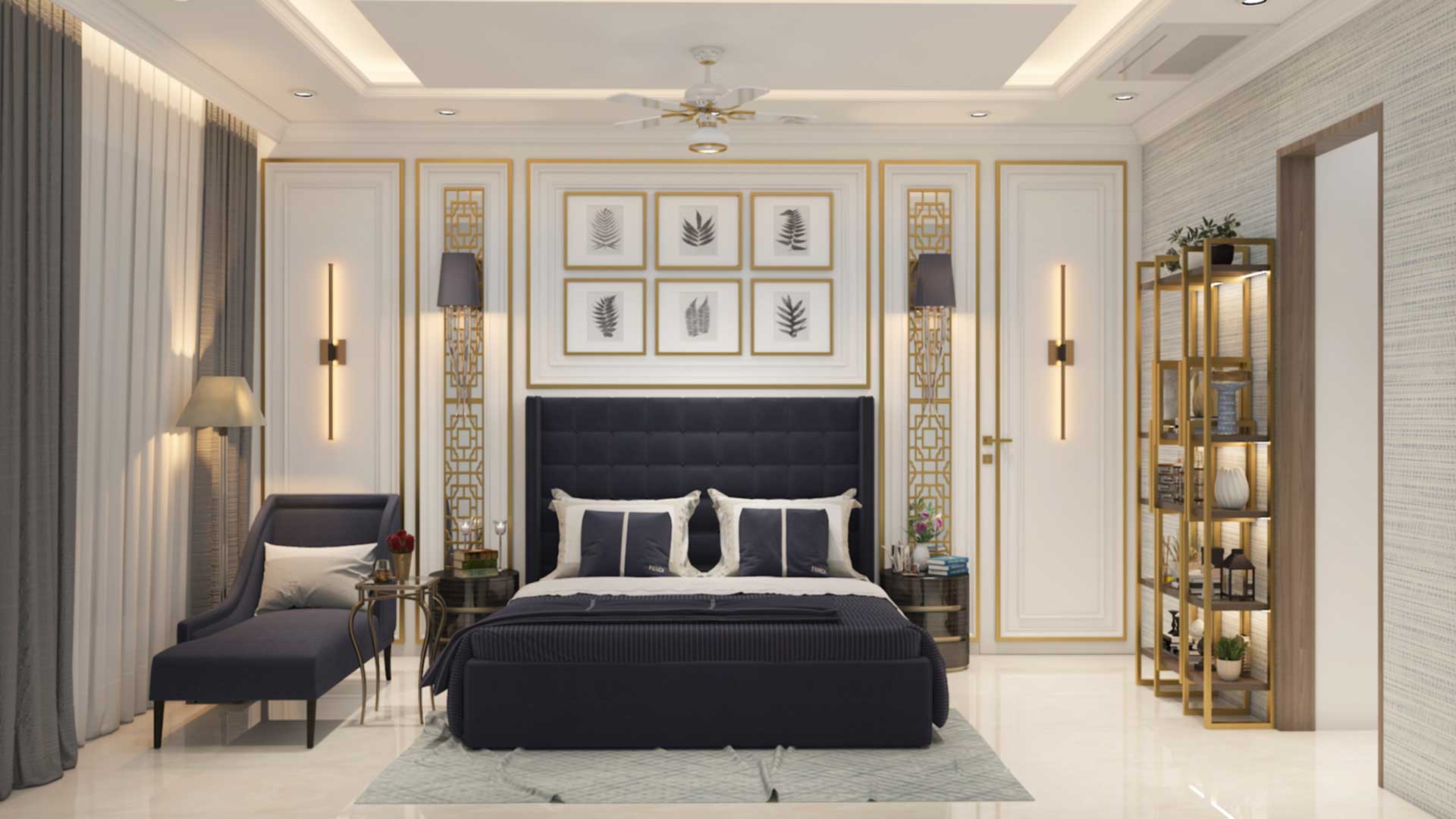 The elaborate back panelling is the showstopper for this master bedroom. Detailed mouldings, gold accents, sophisticated accessories and furniture along with the deep blue furnishings give a royal look to this master bedroom.