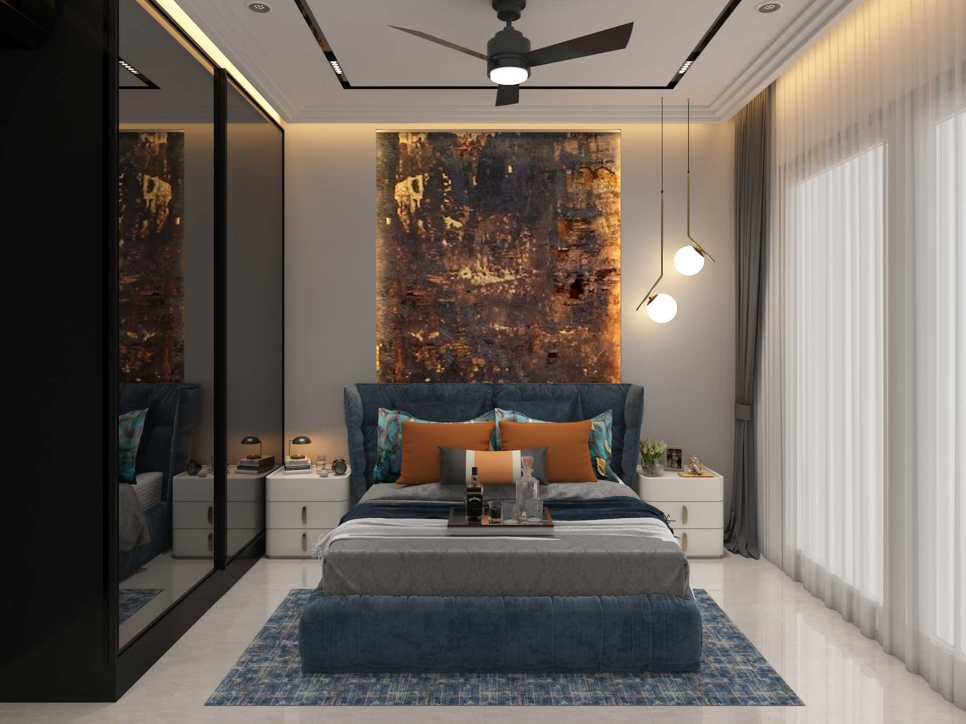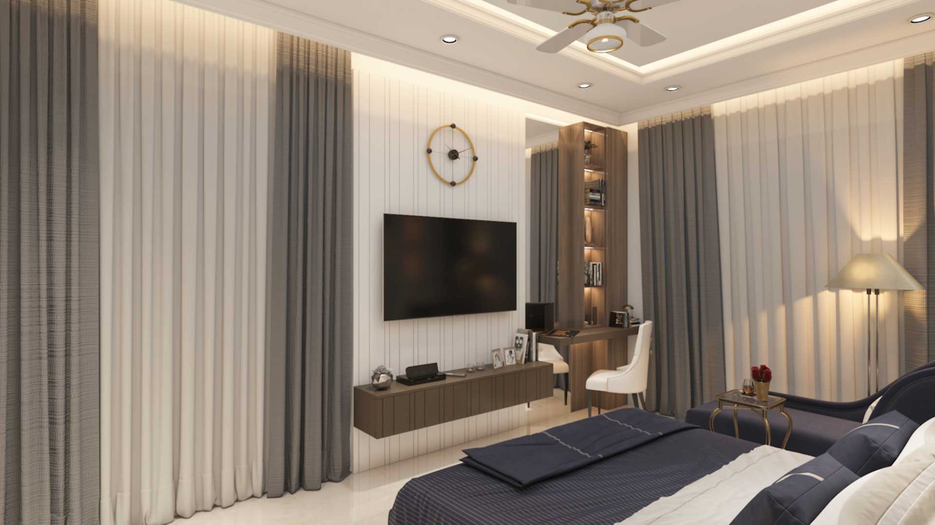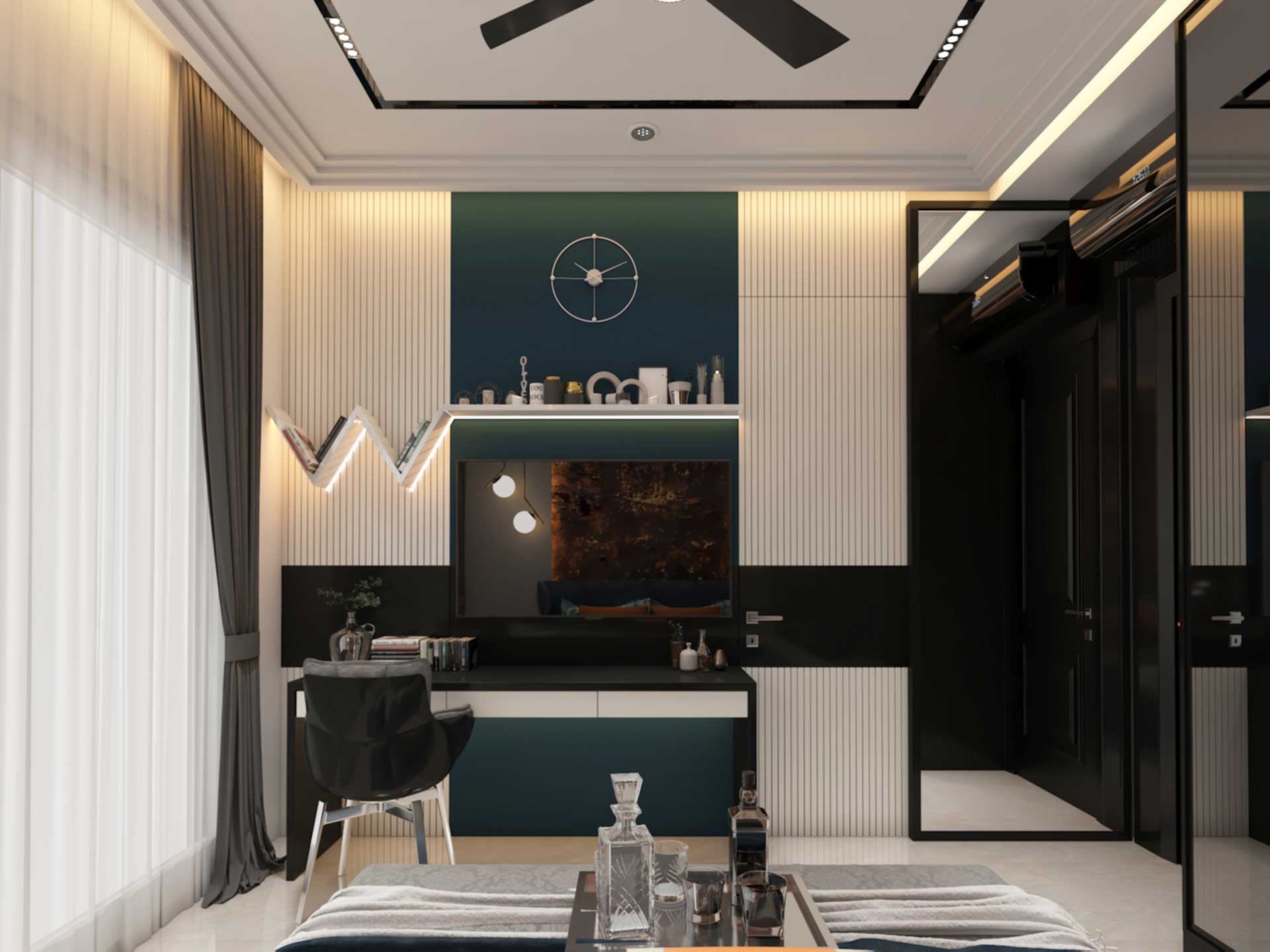 The highlighted back panel texture is the charm of this bedroom. This, together with the mirror shutter, grey tones, and blue cyan concept of the bedroom, forms a contemporary luxury bedroom. The geometry of this wall of the bedroom with tv, study unit and flush door adheres to the contemporary luxury language of the space and adds to its appeal.