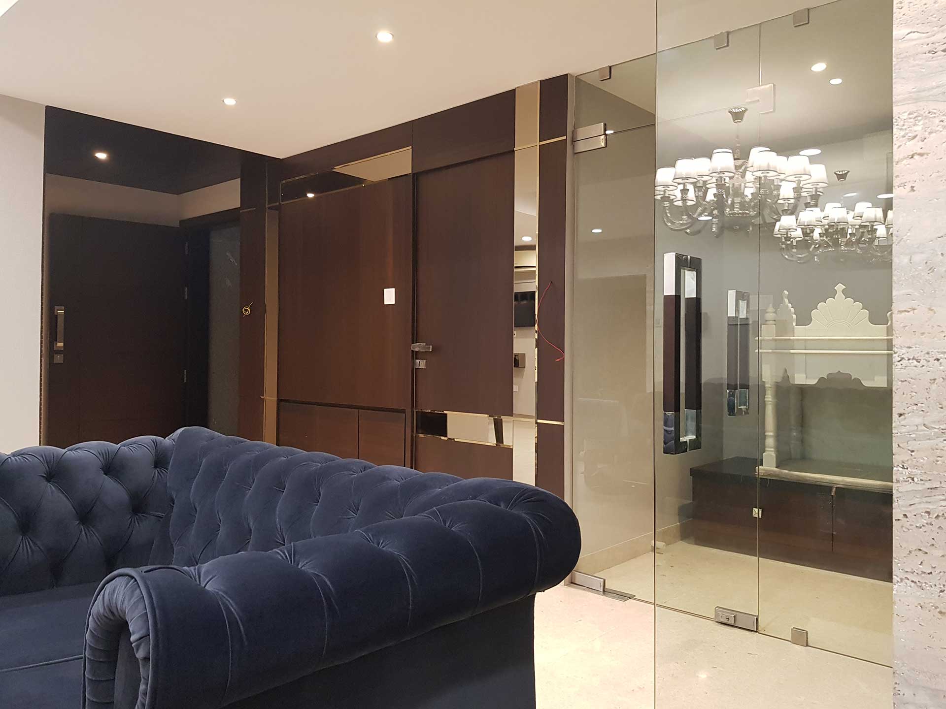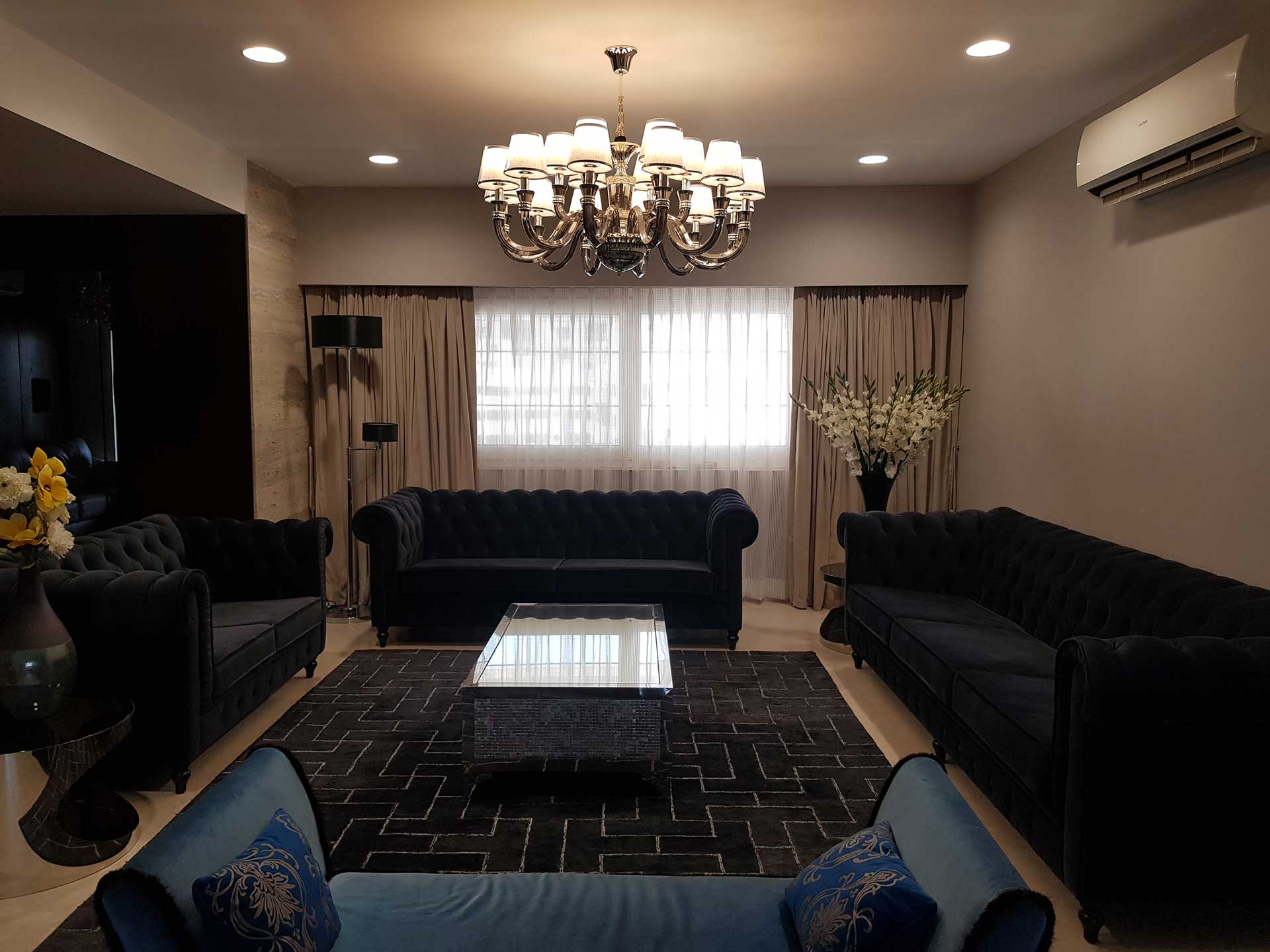 This spacious living room is a combination of muted palette, exquisite chandelier and deep blue furnishings.