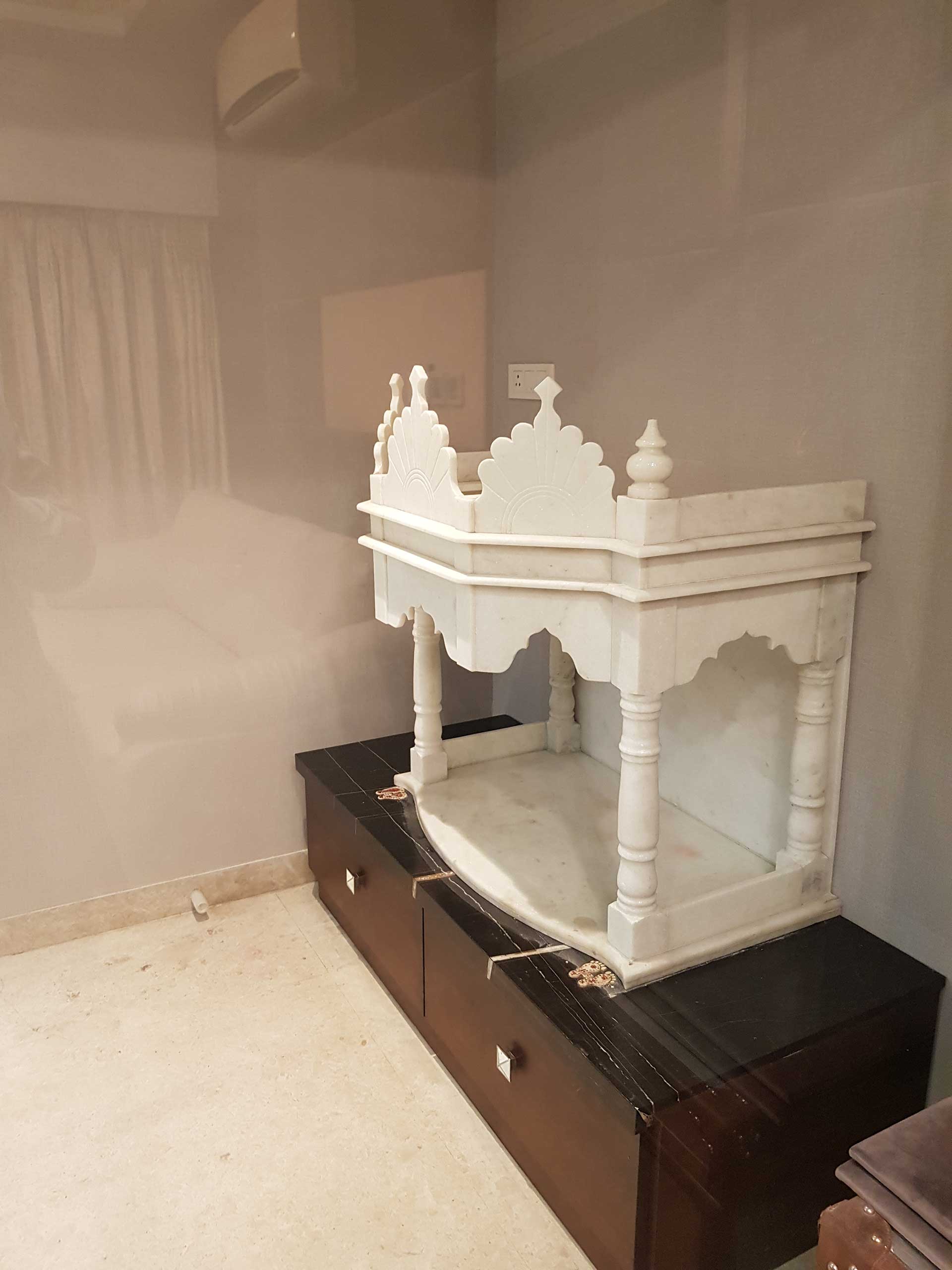 The mandir has a precise smooth cut in marble placed on top of a clean storage unit.