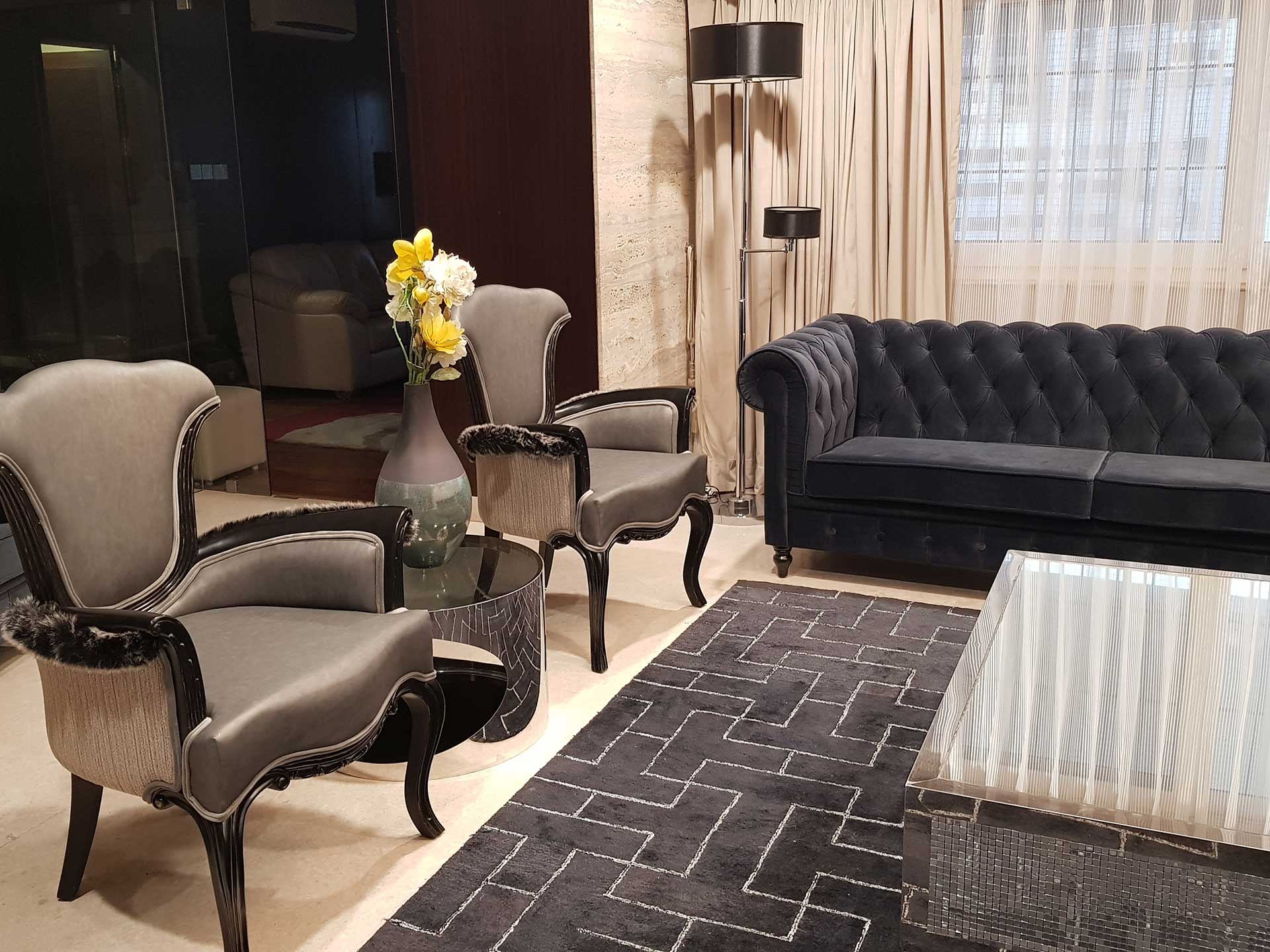 The main character of this room is this accent chair which paired with chesterfield sofa gives contemporary design look.