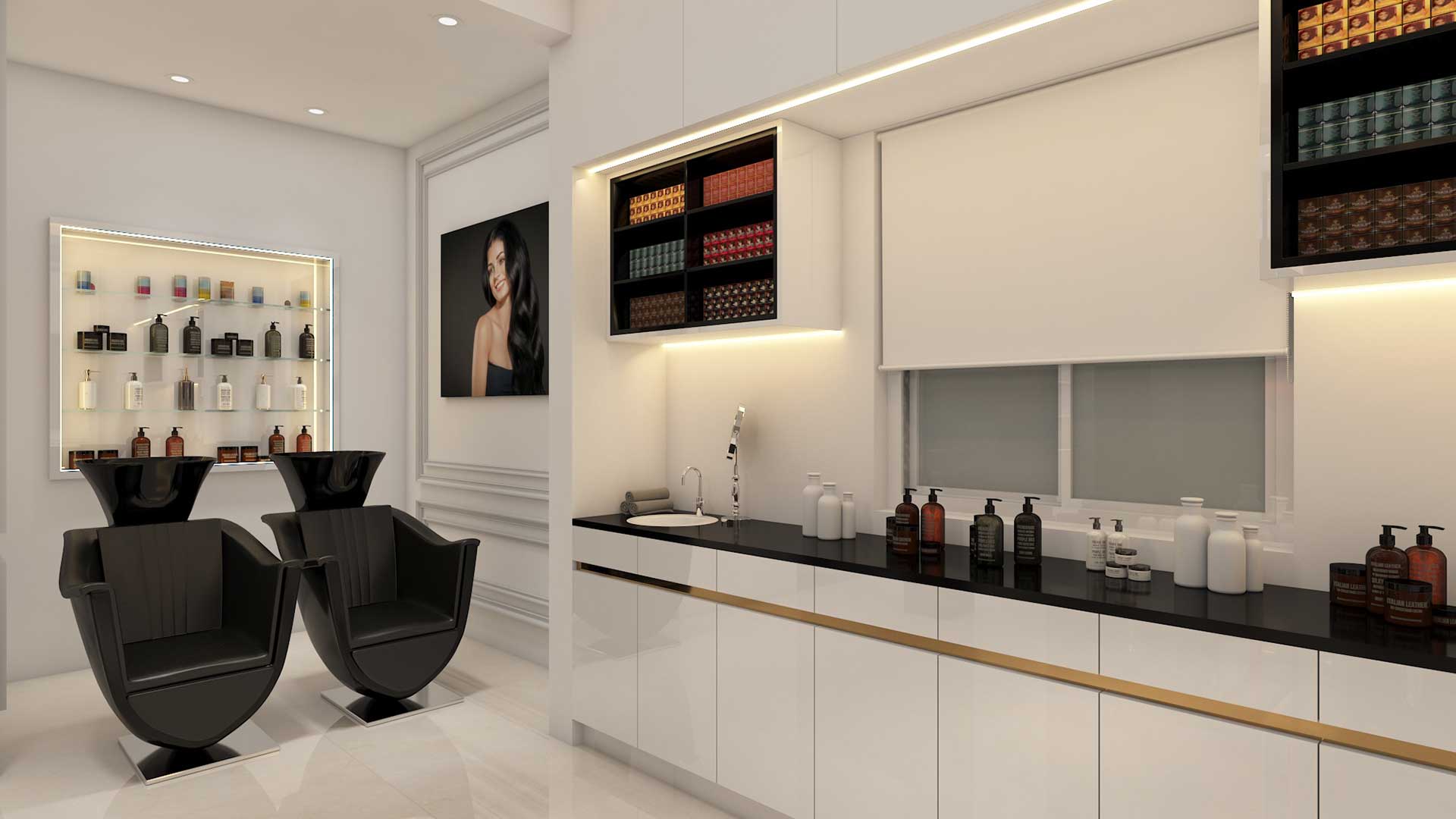 This is the salon's element, which continues with the concept of geometry through sleek double-sided mirror and rose gold highlights. When coupled with cushioned seats and soft lighting encourage clients to relax.