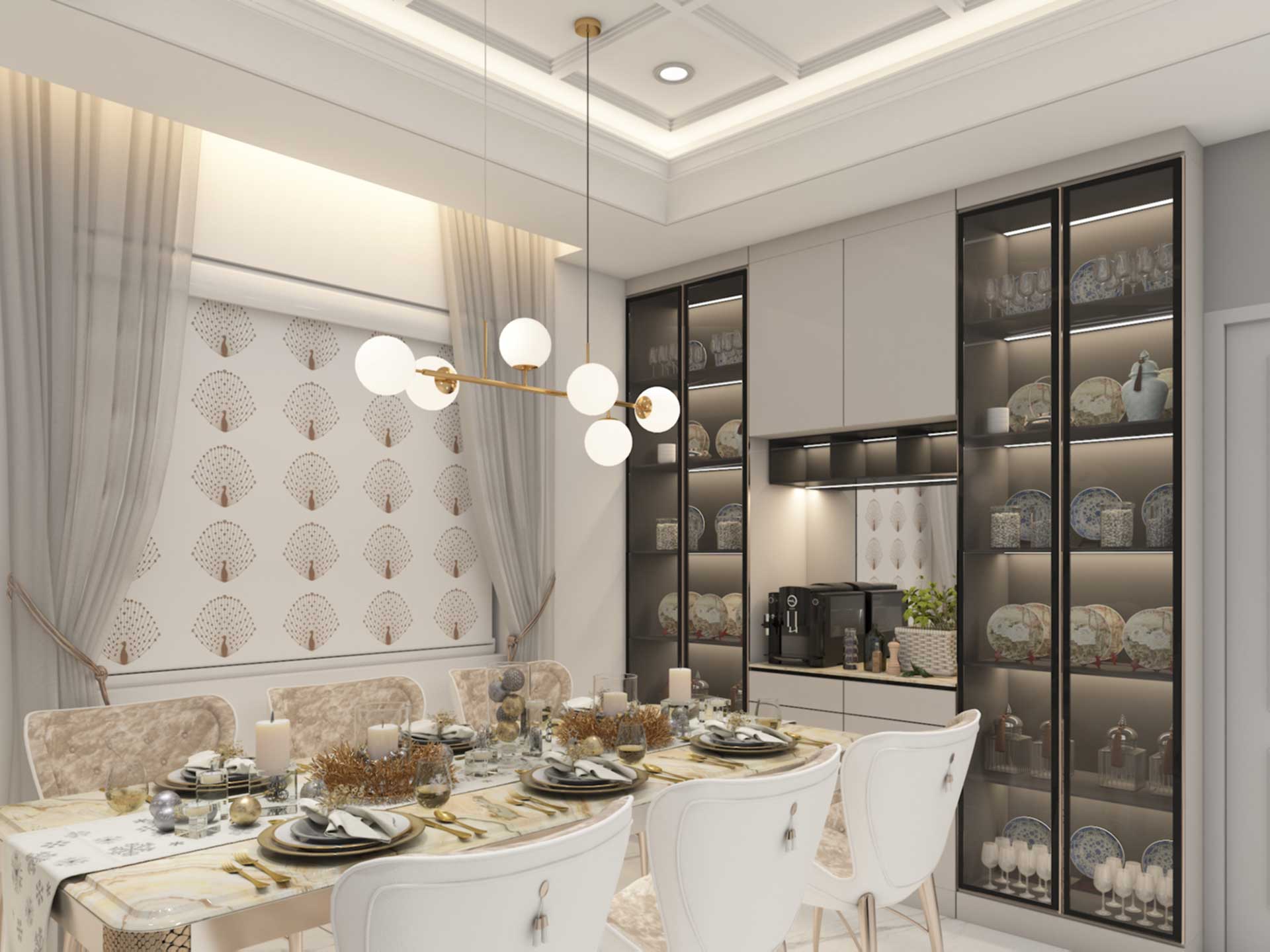 The sleek neat crockery display unit, elegant dining furniture and creamy hues make perfect setting for a hearty meal in this dining room.