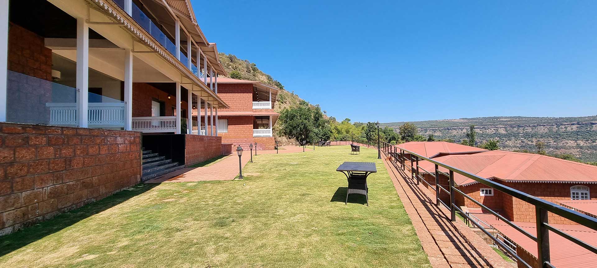 Based on the hills of Mahabaleshwar, this open area of the resort is for small gatherings and party. With paths lit with classic mid-century bollard lights and a background of the timeless resort brimming with features, this sets the stage for a fantastic photo backdrop.