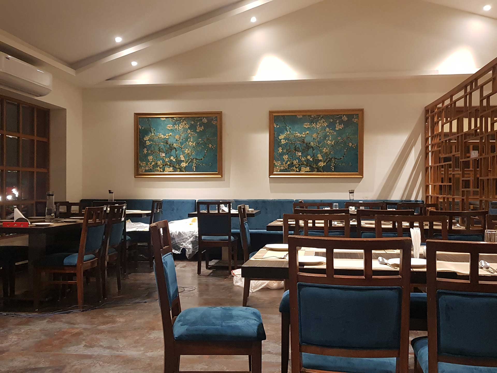 This is a mid-century theme dining hall based on geometric shapes, that prefer function over forms with minimal ornamentation and well blended materials and textures. The space is in tones of neutral with veneer shades complemented with pop blue fabric and floral painting.