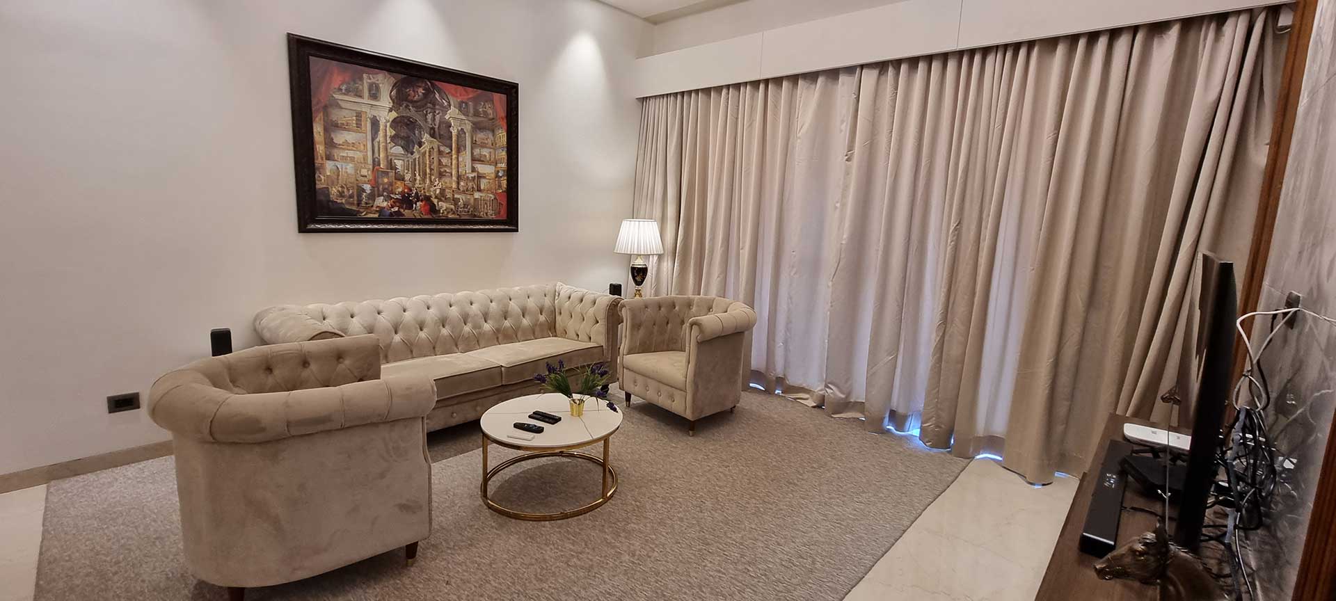 The contemporary neutral themed living room of the resort is made of plush regal furniture complemented with a detailed painting and a contemporary centre table.