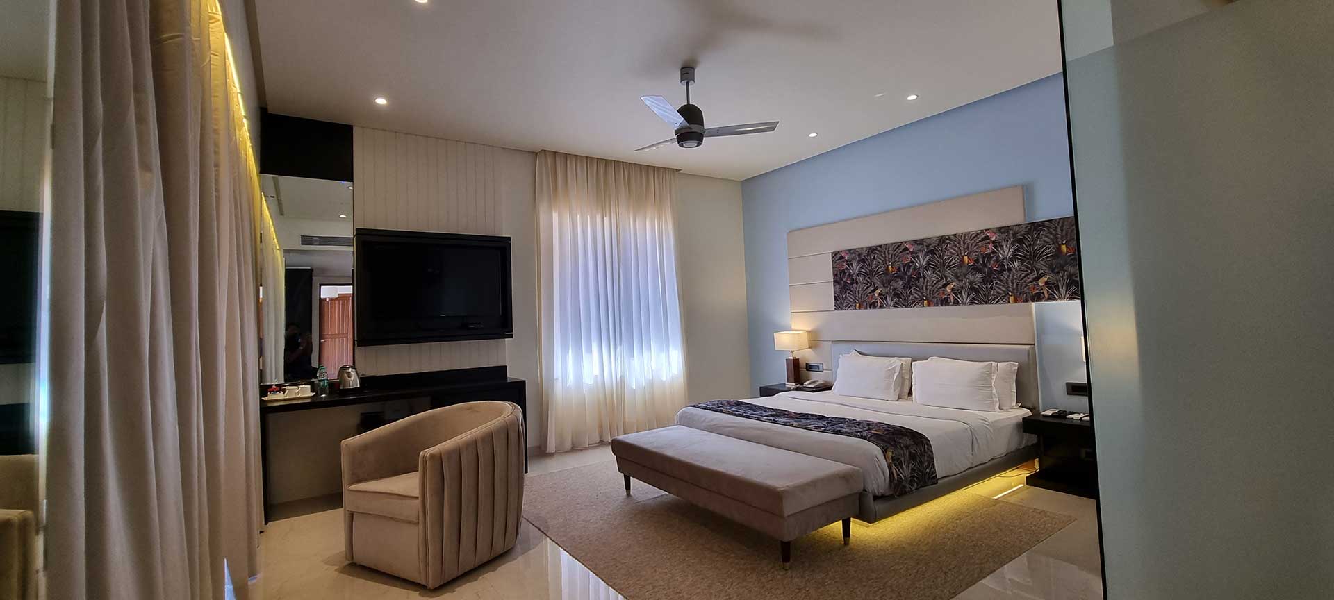This room is with sleek and neat design that appeals to every guests’ taste. The neutral palette with pastel wall and highlight headboard is a charm to the soft geometry of the room in furniture and furnishings. The side table lamps add to the authenticity of the space. The room is designed to cater all requirements of the guests.