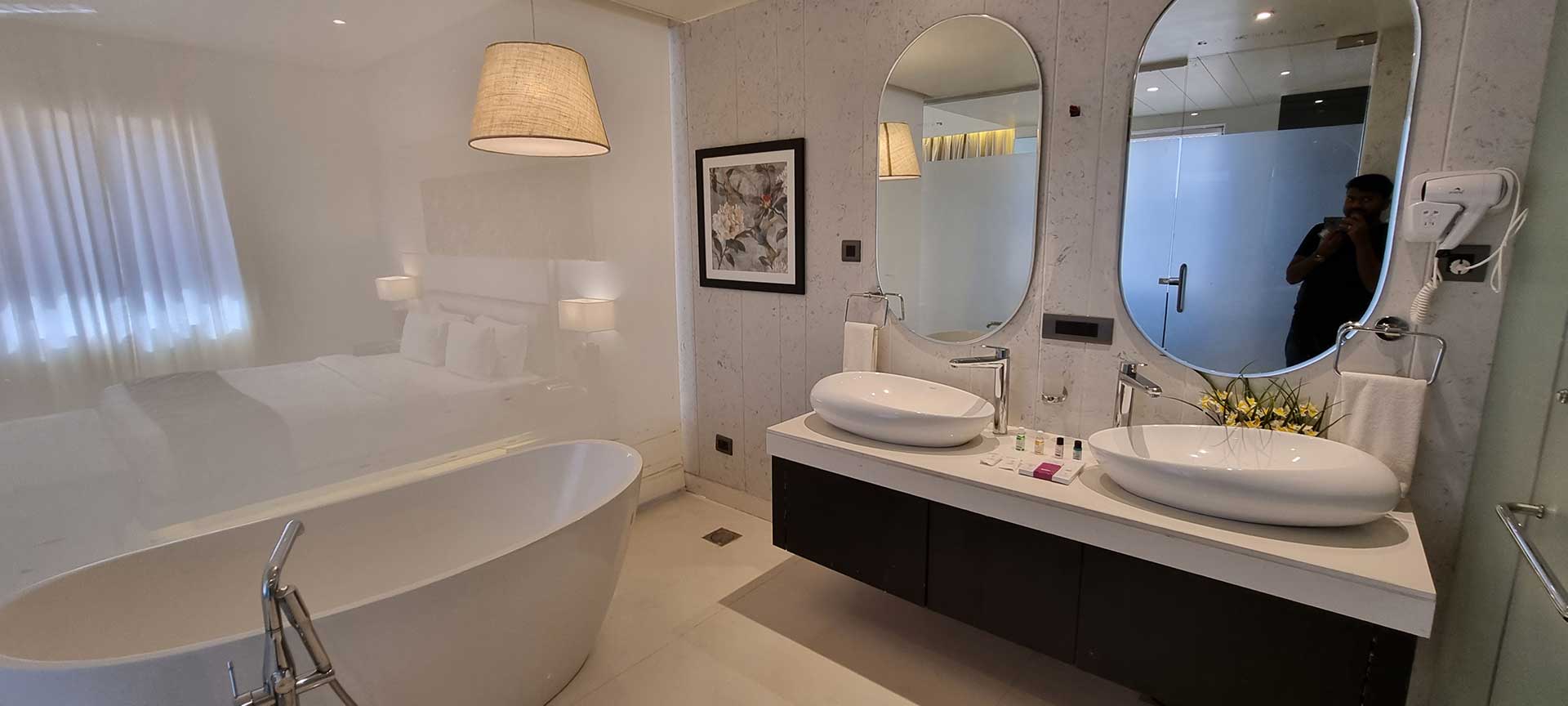 The bathrooms, like the rooms, are soft-toned and fitted with such fixtures and fittings, which welcome visitors to unwind with a relaxing soak in the tub.