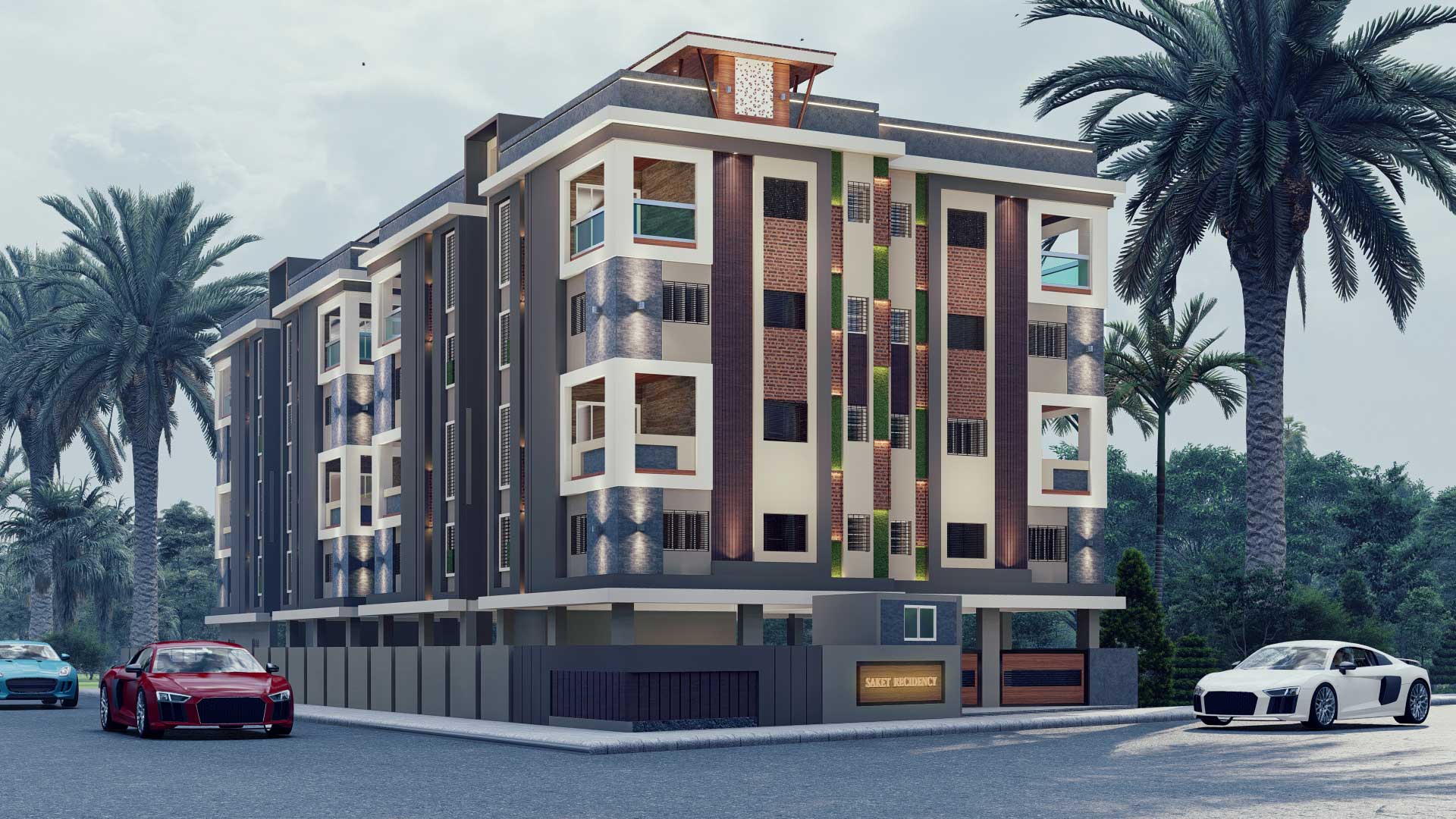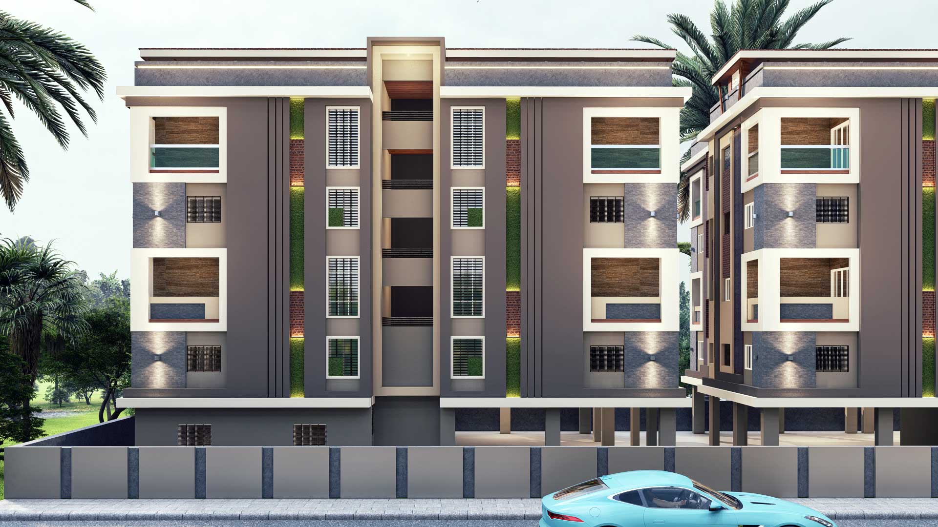 The perfect blend of material and texture palette through veneer, concrete, bricks, glass and steel give the property a sophisticated look. The light play on the façade appeals to its luxurious aesthetics.